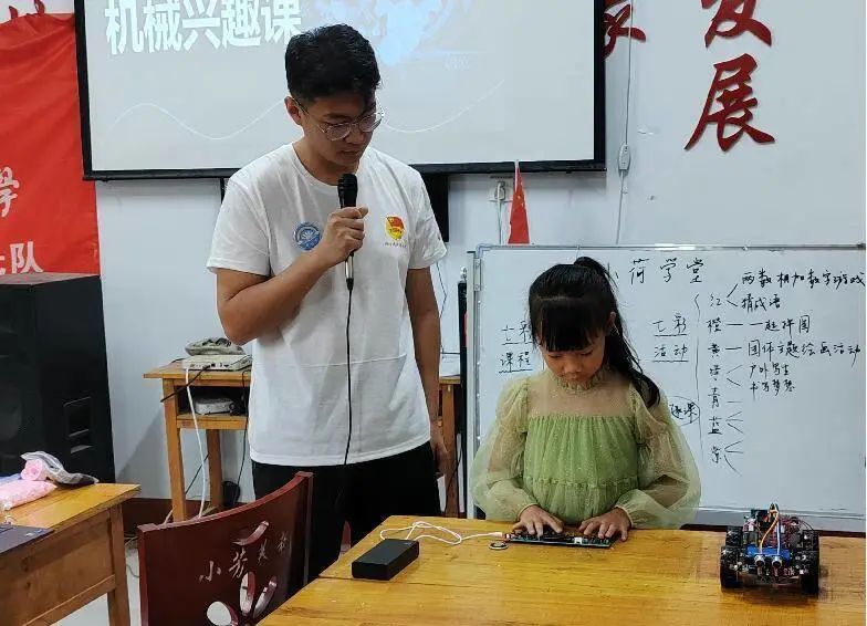 志愿者还为孩子们开展机械兴趣课,将木板、电池、电线等简单的零件用焊枪组装成小车,在啧啧称奇声中,每个孩子都体验到了当小工程师的乐趣。