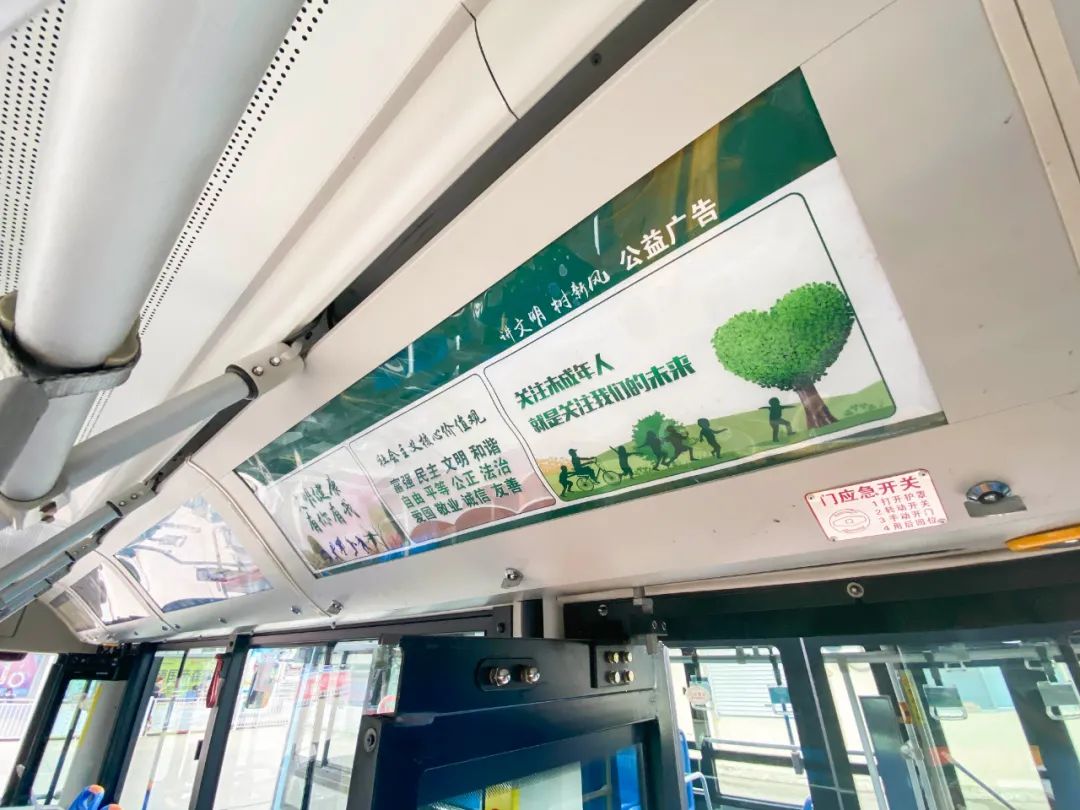 车厢内公益广告随处可见:灯箱印有“讲文明树新风”宣传标语,车尾LED屏也滚动播放着“文明健康有你有我”等标语,车内设有禁止吸烟、禁止车窗抛物、主动为特殊人群让座等提示语,公交车俨然成为宣传城市文明、弘扬新风尚、传递正能量的流动课堂。