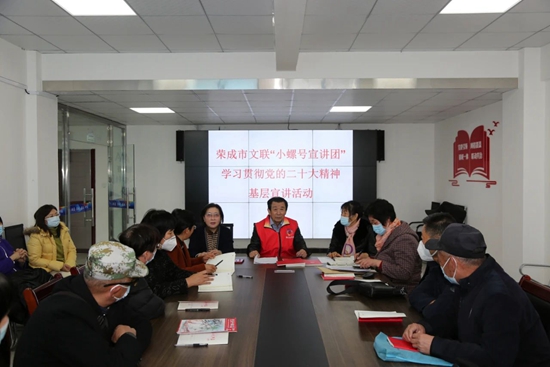 彭晋堂是荣成市文联“小螺号”宣讲团的宣讲员,他用乡味乡音,以身边小事为切口,围绕深刻领会过去五年的工作和新时代十年的伟大变革的重大意义、牢牢把握新时代新征程中国共产党的使命任务、全面把握中国式现代化的战略举措三个方面,把“书面语”转化为“家常话”,把“大道理”转化为“小故事”,全面细致地宣讲党的二十大精神,分享自己的心得体会。